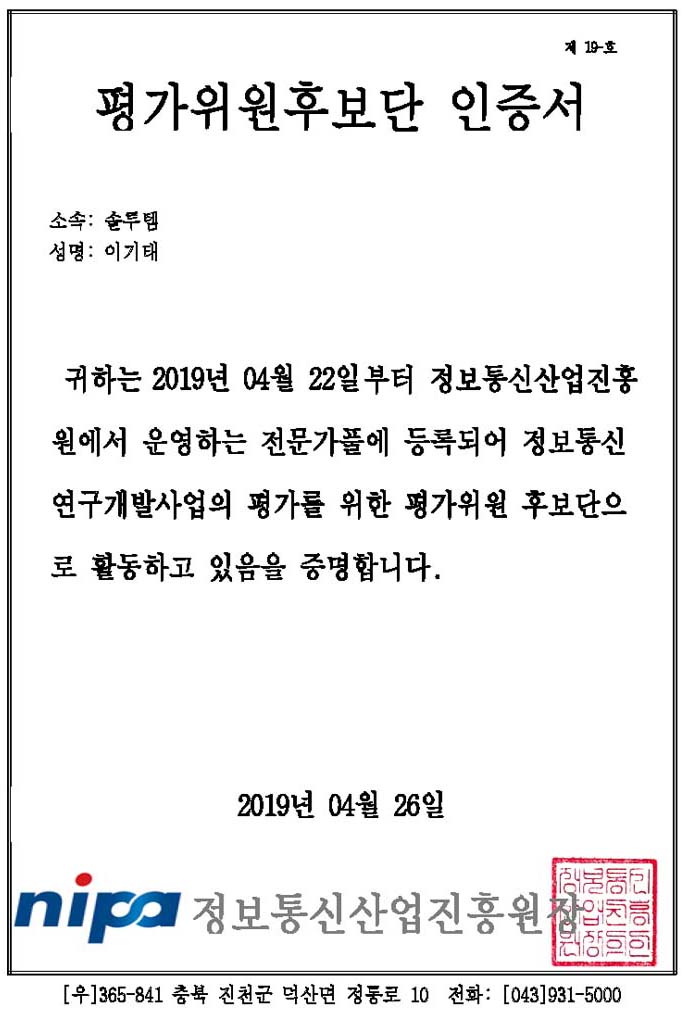 이 번에 (주)솔루템 이기태는 정보통신산업진흥원(NIPA) 평가위원으로 아래와 같이 되었습니다.