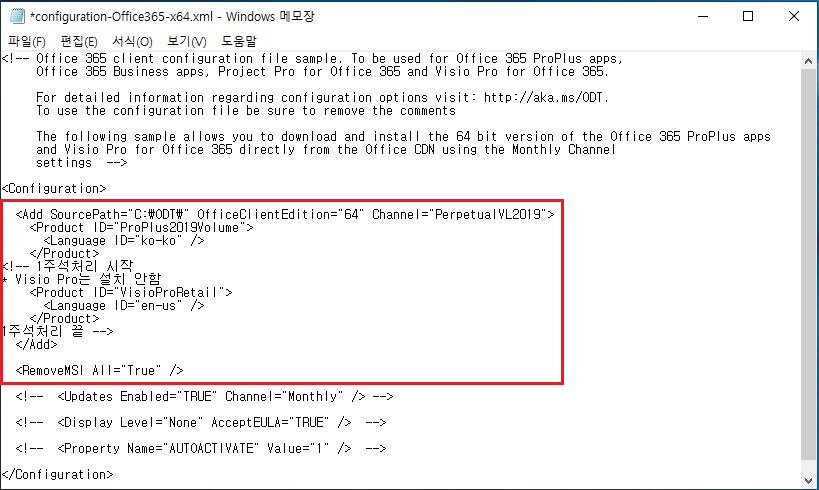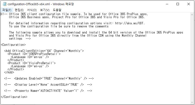 64bit 설치를 원하시면 "configuration-Office-x64.xml" 파일을 메모장에서 엽니다.