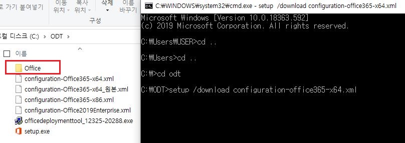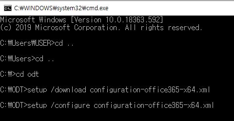 - 다운로드 명령(64bit인 경우) : setup /download configuration-Office365-x64.xml
