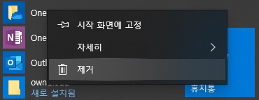 시작메뉴에서OneNote, OneDrive, Word, Excel, Powerpoint, Visio, Publisher등의 Office 관련 APP을 제거.