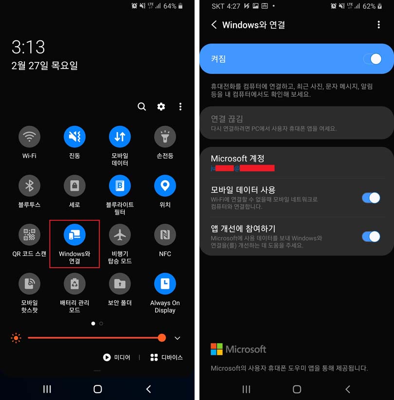 2. 휴대폰에서 Windows 계정 로그인 하기(빠른 설정에서 Windows와 연결)