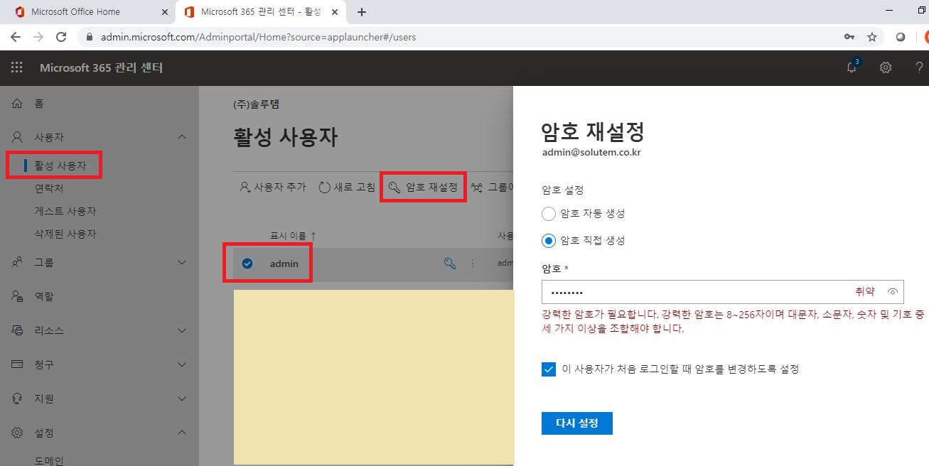 2. 관리자가 사용자의 암호를 재설정하는 경우(암호 직접 생성)