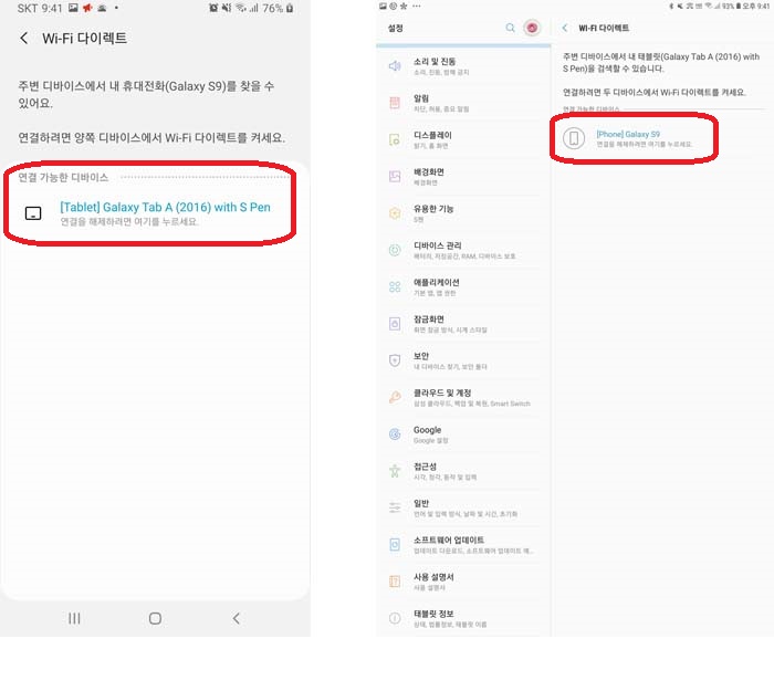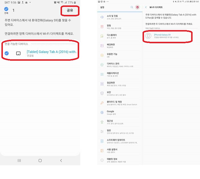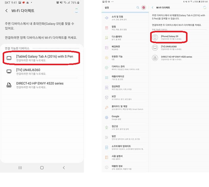 오른쪽 테블릿 화면 : 와이파이 연결된 상태에서 상단의 "Wi-Fi 다이렉트" 선택