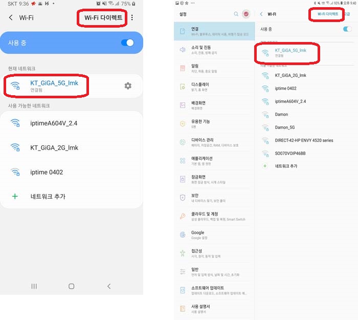 1. 왼쪽 휴대폰 화면 : 와이파이 연결된 상태에서 상단의 "Wi-Fi 다이렉트" 선택