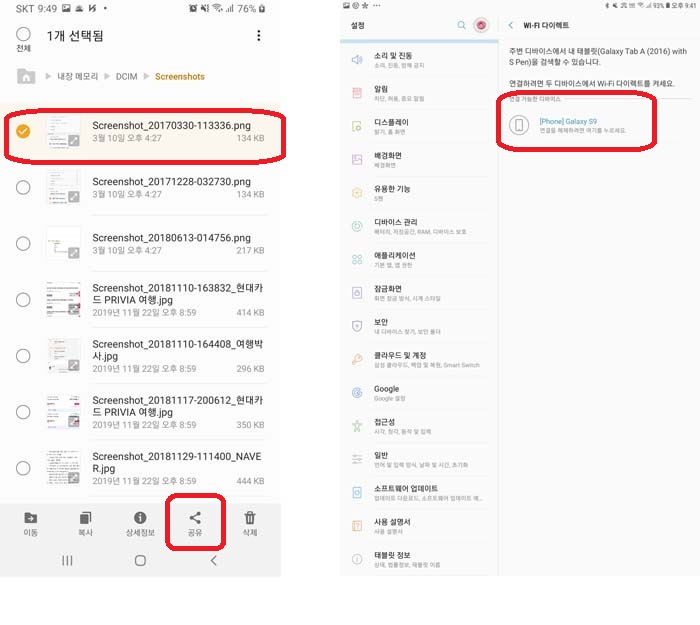 5. 휴대폰에서 테블릿으로 보낼 이미지 등의 파일을 선택하고 "공유" 선택