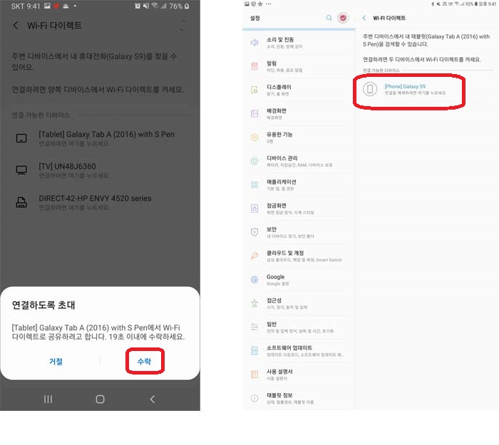 2. 휴대폰에서 먼저 "테블릿명" 선택하면 테블릿에서는 "수락" 또는
