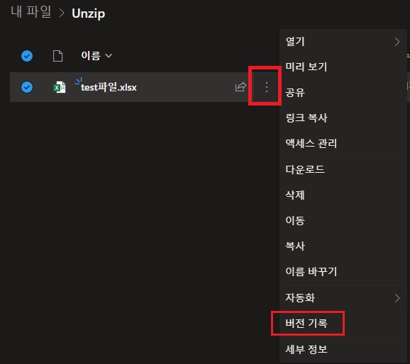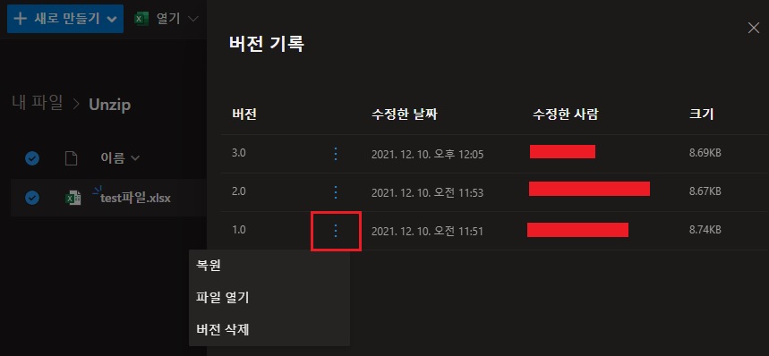 3. 아래와 같이 test파일.xlsx는 3번의 수정이 있었습니다. 각 버전에 대해 점3개를 클릭하시면 복원, 파일 열기, 버전 삭제를 하실 수 있습니다.