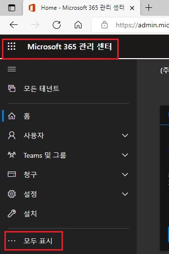 1. Microsoft 365 관리 센터 관리자로 접속 : https://www.office.com/ => "관리" 메뉴 클릭 => "··· 모두 표시 클릭"