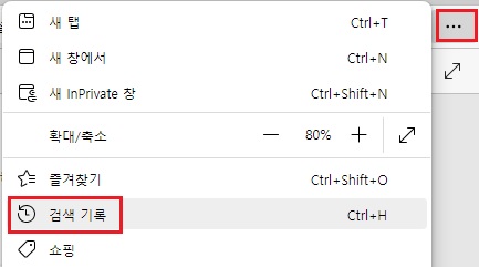 | * Edge 브라우저 오른쪽 상단의 점 3개 클릭 -> 검색기록 클릭 -> 오른쪽 이미지 참고 ![]() |