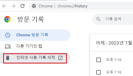 * "인터넷 사용 기록 삭제" 클릭 -> 아래 이미지 참고