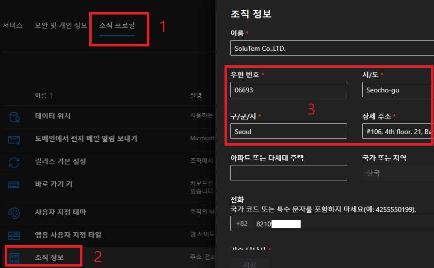 Microsoft 회사 주소 수정(구매자 주소 변경, 청구지 주소 변경) - 솔루템