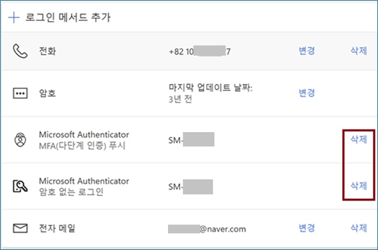 -> 왼쪽 메뉴의 "보안 정보" 클릭 -> 오른쪽 내용중 "Authenticator" 2가지 삭제