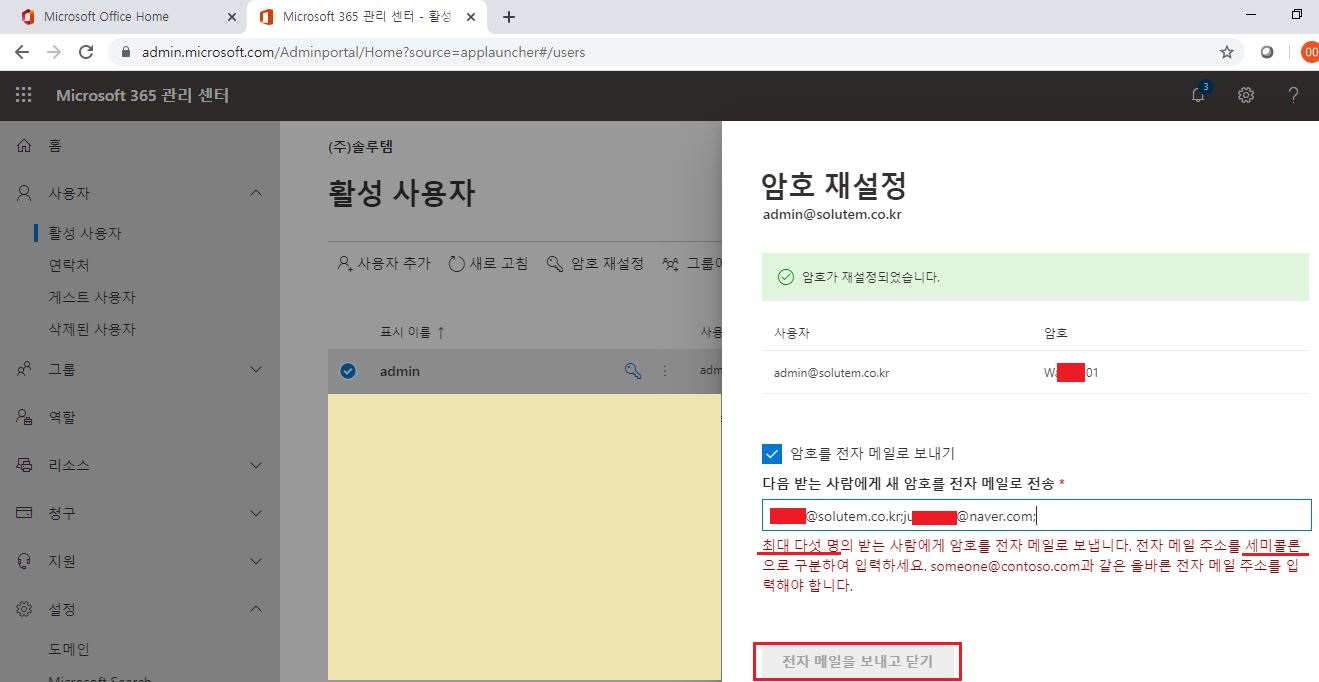 1. 관리자가 사용자의 암호를 재설정하는 경우(암호 자동 생성)