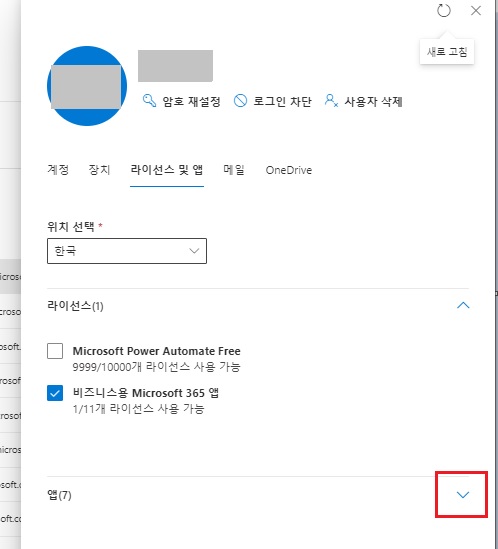 2. 라이선스 및 앱 탭에서 하단의 화살표를 클릭