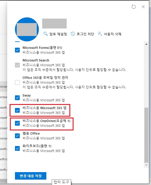 1. Microsoft 365 관리자 메뉴 => 활성사용자 => 해당 사용자 선택 => 제품 라이선스 관리 클릭