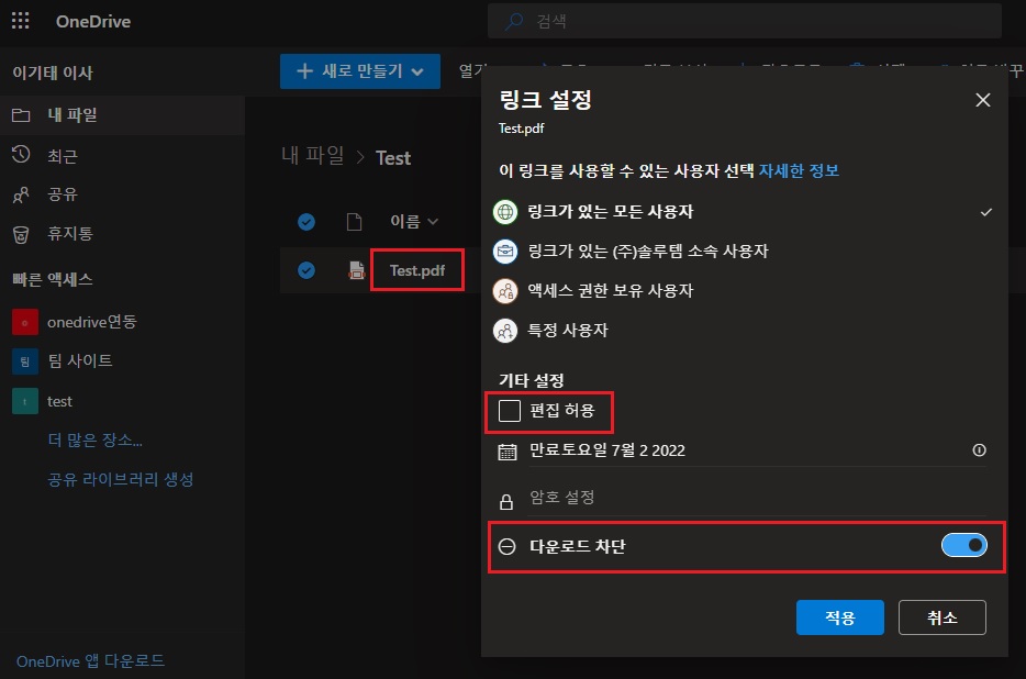 회사 사정에 따라 OneDrive의 사용 권한을 제한할 수 있습니다.